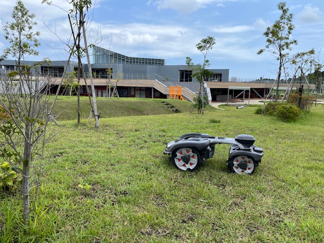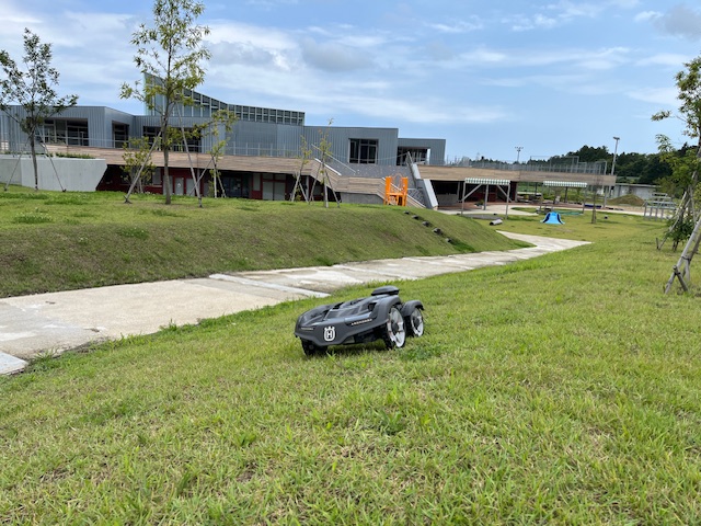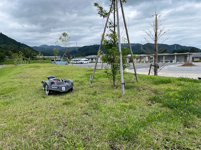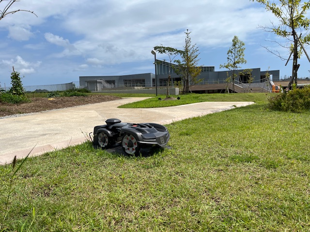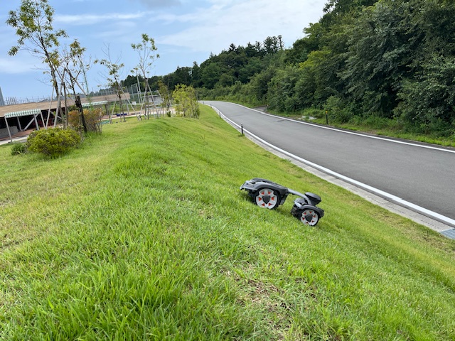 大熊町の新教育施設においてオートモア435X AWD NERAが急斜面の芝刈りを開始しました。[新教育施設・西斜面] 2025年10月15日 大橋 稼働場所は大熊町大川原地区復興拠点に町内での学校教育を再開するため、令和5年9月21日に落成された教育施設の外周道路沿いの急斜面です。大熊町復興通信に「大熊町新教育施設・学び舎ゆめの森」の事業の目的、経緯、落成式典の当時の模様が記録されています。大熊町復興通信にリンクします。 大熊町新教育施設西斜面を稼働する、オートモア435X AWD NERA 「新教育-3号機」 ただいま充電中。チャージステーションとパワーユニットを収納した電源用ウオルボックス